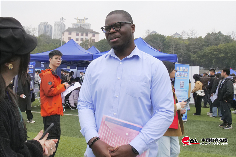 来自尼日利亚的西南大学留学生Miracle手持中英双语简历在多个展位深入洽谈。他在接受采访时表示:“今年我即将完成学业,在中国求学期间受益良多,这样大型的招聘活动,为我们这些留学生寻找合适的工作岗位提供了极佳的平台。”