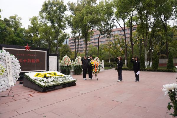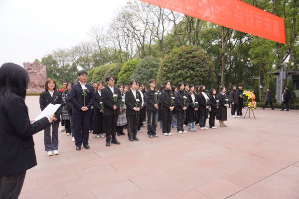 家国又清明,鲜花献英烈。陵园内,翠柏参天,革命烈士纪念碑巍然矗立。上午11时,清明祭英烈仪式正式开始。同学们整齐列队,向革命先烈默哀、敬献花篮,花篮缎带上“革命烈士永垂不朽”八个鎏金大字格外醒目。随后,同学们举起右拳,重温入党誓词,在铿锵有力的宣誓声中更加坚定了自己的初心与使命。