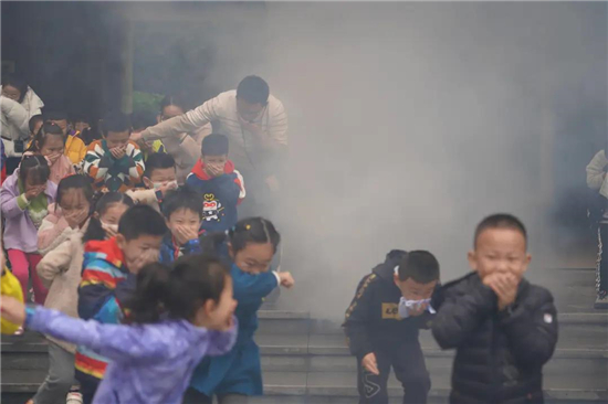校园里,警报声响,浓烟滚滚。保安、各楼层老师迅速就位,班主任,班级联盟老师护送本班孩子有序撤离。