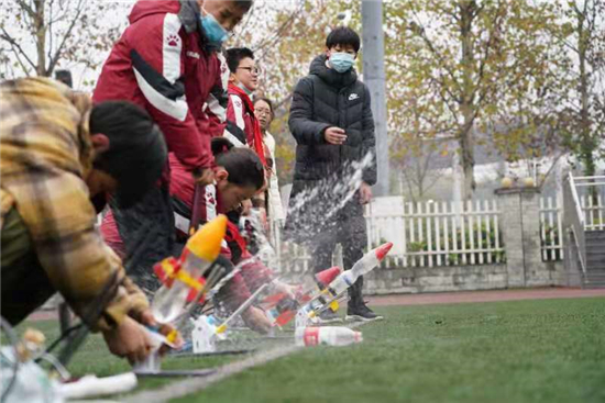 水火箭展示:一个个装饰精美的水火箭带着各位制作人的期盼,喷出激情的动力或旋转,或直挺地一飞冲天,场上响起一浪一浪的欢呼声。
