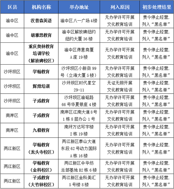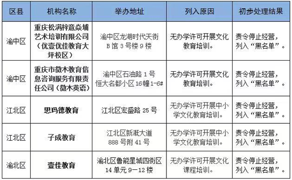 为大力度治理整顿校外培训机构,根据市委、市政府统一部署,近日,教育、市场监管和公安等部门按照《重庆市校外培训机构培训行为集中专项整治工作方案》要求,重拳出击,全面排查辖区校外培训机构,对涉嫌非法办学的校外培训机构联动执法、从严查处,目前重庆市涉嫌非法办学的校外培训机构被相关区县教育行政部门列入“黑名单”进行公布。