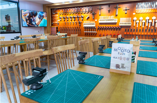 一层是手工坊,里面有各种各样利用废弃物做成的手工制品,还有一排排的小型机具,市民可以利用这些机具对废旧材料进行再加工,体验完整的变废为宝全过程。