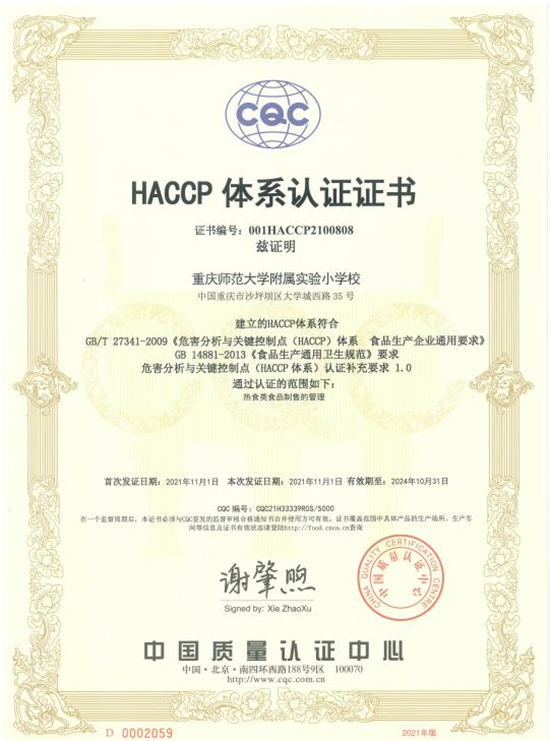 11月1日,高新区市场监管局成功帮扶重庆师范大学附属实验小学获HACCP认证。