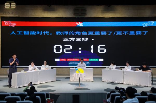 “人工智能本质是工具,人类发明任何工具是解放作用而不是代替。”“数字化时代,老师不再是‘全知全能’代名词,教育也由‘独唱’变成‘合唱’。”正反双方结合自身教育经历,以及对人工智能的认识理解,展开激烈辩论。在三轮“开杠”环节,6位辩手更是唇枪舌战,金句频出,博得现场阵阵掌声,同时也引发与会者对人工智能时代,教师职业角色变与不变的思考。