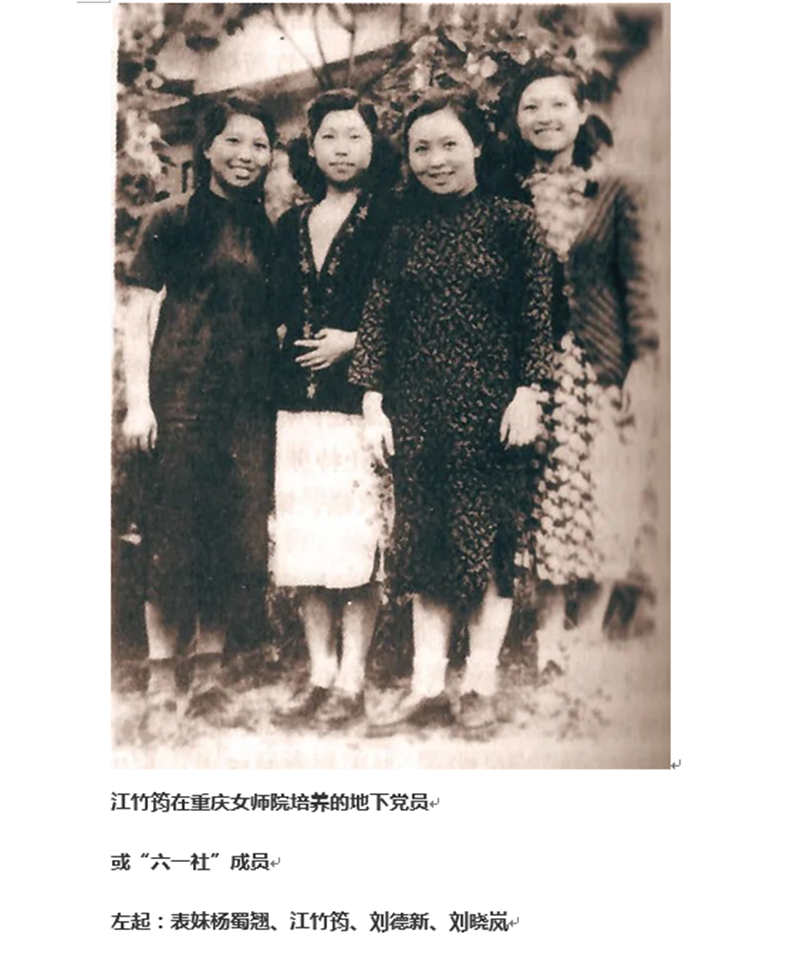 郑劲松还展示了一张珍贵的照片——江姐与她发展的三名女大学生党员的合影,照片上的杨蜀翘是江姐的表妹。据史料记载,江姐从四川大学回到重庆后,其中一项重要任务,是联系重庆的西南学院(私立学校,旧址在重庆南岸)、育才学校和当时校址在九龙坡黄桷坪的国立女子师范学院。江姐发展了学生地下党员10余名,领导和指导学生开展了“反内战、反饥饿”“抗议美军强暴北大女生”等一系列民主运动。这张照片,是郑劲松在江姐的老家——自贡市“淘”到的。照片十分珍贵,是江姐从事学运的重要证据。