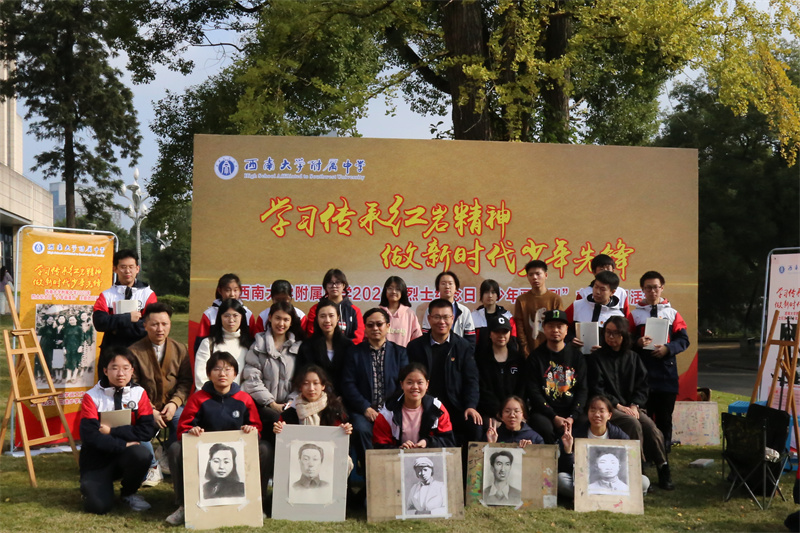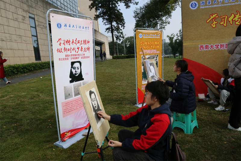 “西大附中是‘大学中的附中’,依托百年大学校史红色资源,开展革命传统文化教育和红色基因培育,是西大附中推进大学中学一体化思想政治教育和德育的有效尝试。”西大附中副校长徐川在活动现场表示,让中学生走进大学校史馆,学习校史上的红岩英烈,把他们画在纸上,印进心里。这既是为了纪念‘1127’大屠杀死难志士,也能让学生零距离接触红岩精神,学习红岩英烈的高尚品质和牺牲精神。