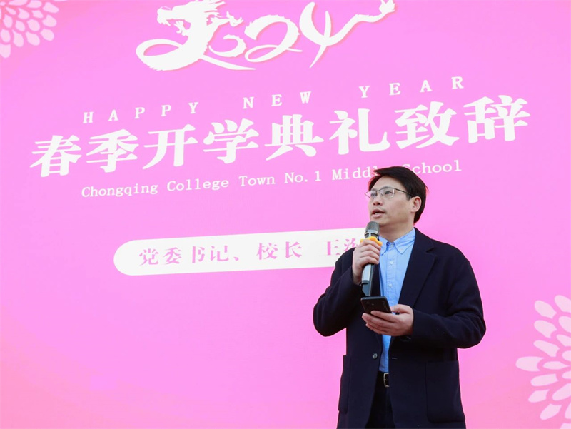 重庆市大学城第一中学校党委书记、校长王海洋,回顾了学校在过去一年所取得的成绩和荣誉,他嘱咐全体学子要时刻牢记自己不仅仅是一名家庭成员、一名班级成员、一名国家公民,也是要珍爱生命,呵护健康的独特的个体,他勉励全体师生,要携手并肩,同前行,在大一中实现人生价值,内修外显,自然天成。