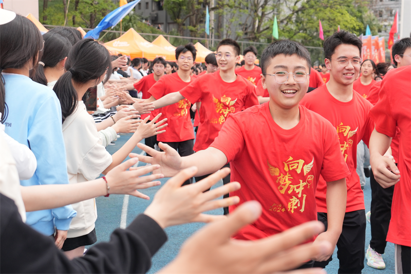 活动当天,西南大学附中初三、高三的学生们还进行了励志跑,毕业班的学生在老师带领下,围着操场尽情奔跑。孩子们在欢快的音乐节奏里,与场边的观众不断互动击掌,一起为即将到来的中考和高考加油!