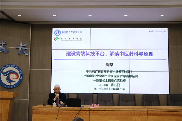 “科学精神和探索能力是打开未来大门的钥匙。”11月25日,重庆第三十中学校迎来了一场充满科学与励志意义的讲座。现任广东省中医院(广州中医药大学第二临床医学院)教授、杰出校友周华,以“建设高端科技平台,解读中医药科学原理”为主题,为重庆第三十中学校高二、高三年级的百余名学生带来了一场视野开阔、启迪思维的分享。