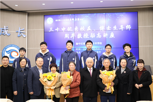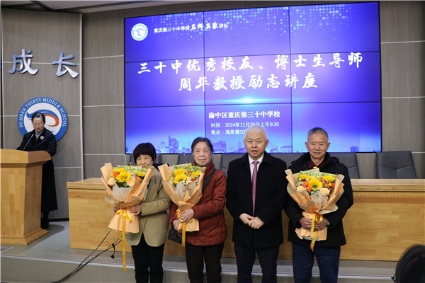 作为重庆第三十中学校初86级、高89级校友,周华教授在讲座正式开始前为三位对他有深远影响的老师献上鲜花,以表达感恩之情。他动情地回忆起自己的中学时代,并以亲身经历鼓励学弟学妹们培养兴趣、主动学习。他特别提到,要以坚持不懈的态度去面对学习中的困难,同时也要注重掌握科学方法,努力适应快速变化的社会环境。