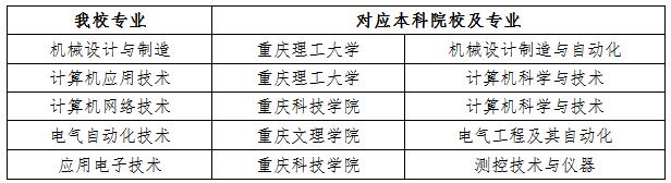 1.专本贯通分段培养项目:经重庆市教委批准,我校面向普通高中毕业生开展“专本贯通分段培养项目”招生,培养全日制本科层次人才。被该项目录取的学生,在我校完成3年高等职业教育学习任务并获得我校颁发的全日制高职(专科)毕业证书。经转段考核录取的学生,在对应本科院校及专业完成2年本科教育学习任务后获得本科院校颁发的全日制本科(专升本)毕业证书、学位证书。