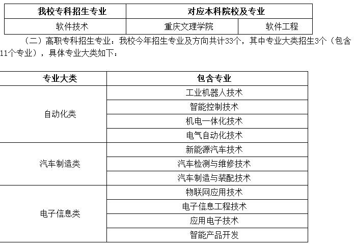 (二)中职类:面向对应类别的中职毕业生招生,培养全日制高职(专科)层次人才。学生在校期间可参加重庆市统一组织的“专升本”考试。