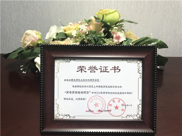 重庆师范大学涉外商贸学院喜获必威体育登录网址 与百度联合举办的“2018全国高考高招咨询项目”荣誉证书