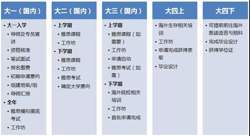 学校在各二级学院设立本硕直通国际班,对报名参加本硕直通项目的学生进行四年全程全方位培育,配备具有海外名校留学经历的专任导师,开设小班全年滚动式语言(200课时雅思学习)学习,实行个性化人才培养,根据学生自身情况和意愿量身选择留学国家、学校及专业,配套内容丰富(文书写作、签证办理、学校及专业选择指导、校级对接等)的留学服务工作坊,帮助学生顺利完成学历升级。
