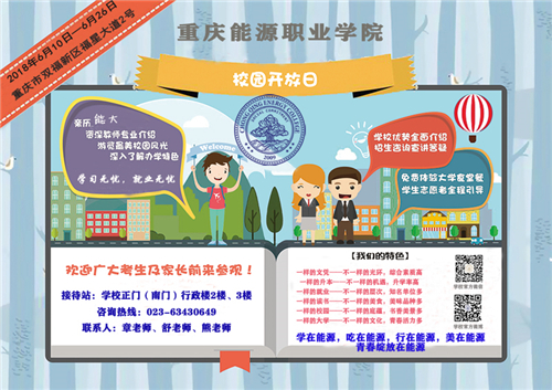 为方便考生和家长全面了解我校办学情况、专业特色、实训设施,实地体验感受校园风光、教学生活环境,6月10日-26日,重庆能源职业学院将举办为期17天的“校园开放日”活动,广迎八方家长及考生参观咨询。