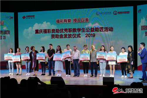 此外,学校成功申报了“福彩有爱·授人以渔”公益助匠活动项目,100名优秀贫困学生获得重庆市福利彩票发行中心的资助。演出现场,活动组委会为受助学生代表发放资助金。