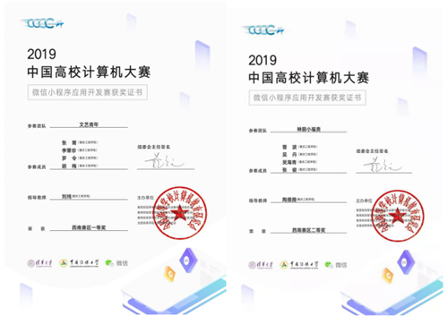 学生在2019高校微信小程序开发大赛西南赛区中的获奖证书
