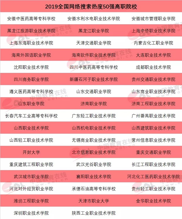 此次评选出的“全国网络搜索热度50强高职院校”榜单,主要采纳必威体育登录网址 高招智能问答系统、全国高校招生数据库搜索排名等数据中来自全国各个省份高中生的搜索、提问和评论数据,对以上指标进行不同权重的加权分析后,最终评选出全国网络搜索热度50强高职院校榜单。在此项公布的榜单中,重庆建筑工程职业学院获评“2019年全国网络搜索热度50强高职院校”。