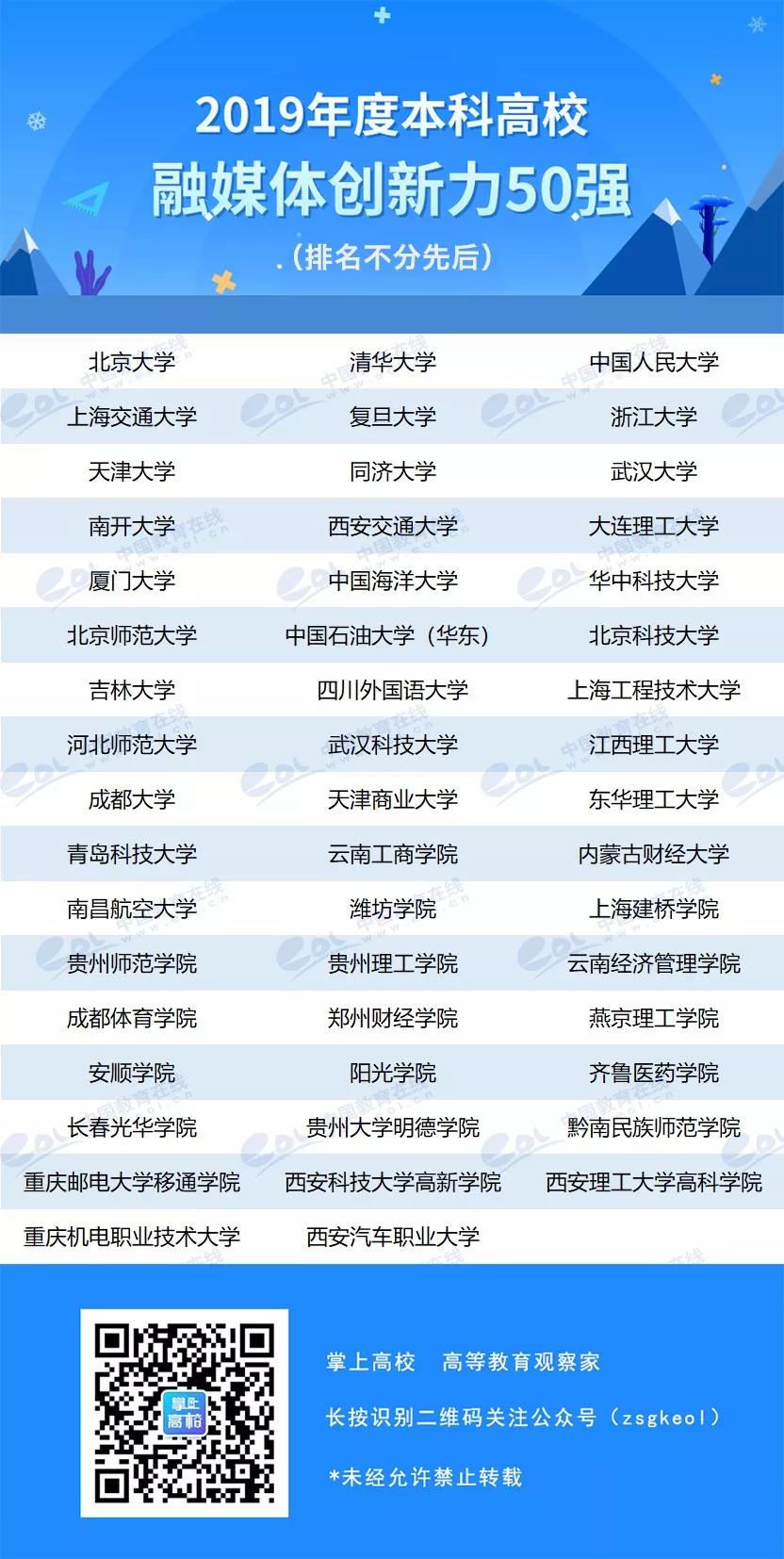 本次“2019年度本科高校融媒体创新力50强”榜单,是综合考虑学校融媒体中心建设、新媒体平台软硬件、新媒体内容生产、新媒体运营、新媒体联盟建设、新媒体技术与应用、网络舆情应对与危机处理,以及新媒体内容的创新性、科学性、传播性和新闻性等数据及指标。在此项公布的榜单中,四川外国语大学获评“2019年度本科高校融媒体创新力50强”。