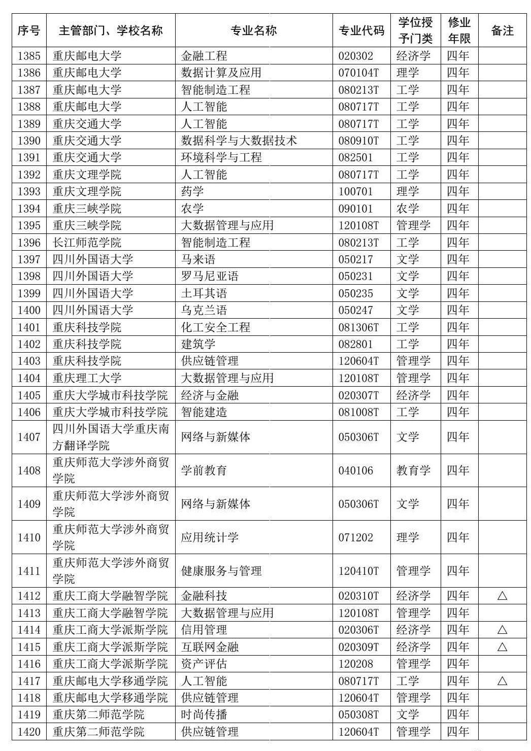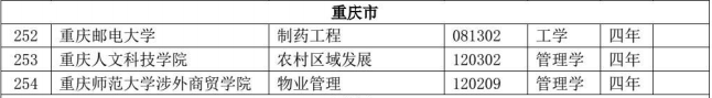 其中,重庆高校新增备案本科专业36个,新增审批本科专业2个,调整调整学位授予门类或修业年限专业7个,撤销本科专业3个,本科专业结构得到进一步优化。重庆邮电大学、四川外国语大学、重庆师范大学涉外商贸学院各新增4个备案本科专业,重庆交通大学、重庆科技学院、重庆工商大学派斯学院各新增3个备案本科专业,重庆文理学院、重庆三峡学院、重庆第二师范学院、重庆大学城市科技学院、重庆工商大学融智学院、重庆邮电大学移通学院各新增2个备案本科专业,重庆理工大学、长江师范学院、四川外国语大学南方翻译学院各新增1个备案本科专业。