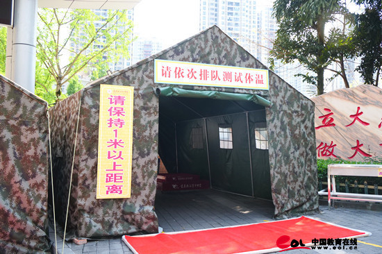 在两江育才中学校门口,记者看到大门口共设置了4个专用入校通道,并设置了红外线检测系统、警戒线、临时观察室,并配备了免洗酒精、消毒垫、一次性手套、防护衣、急救箱等防疫物资。据了解,学校安排学生分时间分批次到校,经检测安全入校后由规定路线保持间距进入教室。