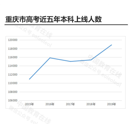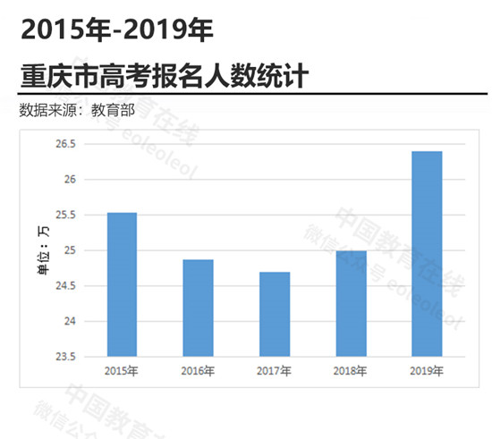 2019年,重庆市高考报名人数26.4万,达到近五年来最高人数。据统计,重庆市在2015年高考报名人数达到25.54万后,报名人数有所下降,直到2018年开始回升。