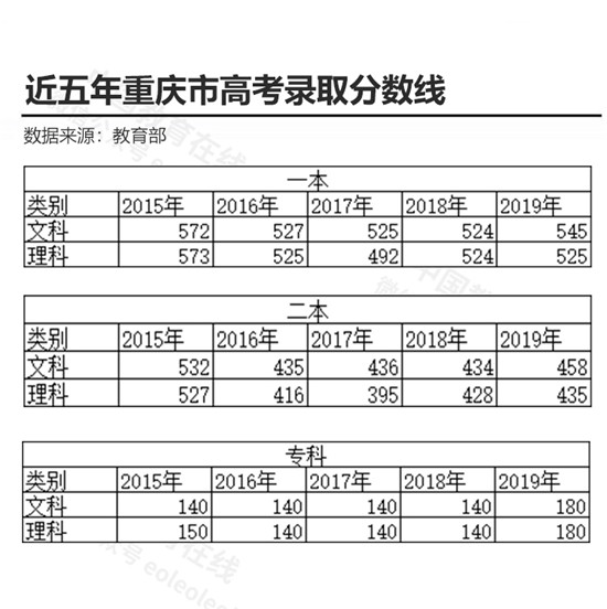 重庆市高考从2016年起实行全国卷,同年,本科二批和本科三批合并,专科一段和专科二段合并。