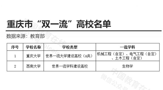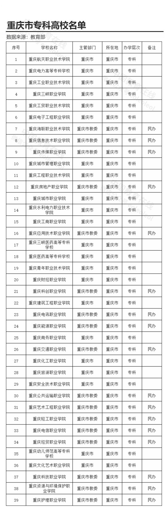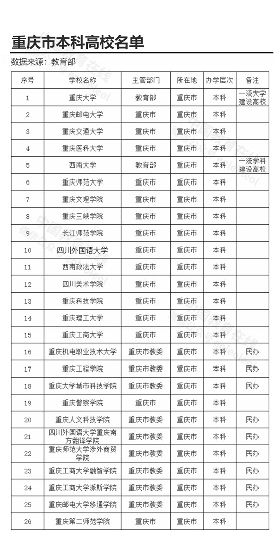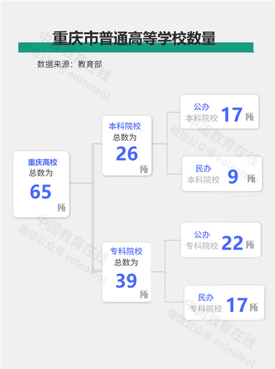 根据教育部公布的名单显示,截至2019年6月15日,重庆市共有普通高等学校65所。其中本科院校26所(公办17所,民办9所)。专科39(公办22所,民办17所)。详细名单请见文末。