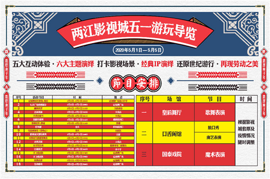 据悉,今年的“五一”期间,尽管重庆市两江影视城不会像往年那样开展大型聚集性活动,但为了满足游客的需要,两江影视城依旧会推出多项互动体验活动让游客们能有一个愉快的假期。