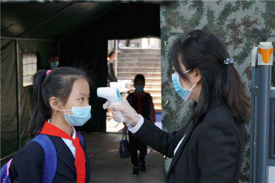 学生下车后,按一米间隔排队等候。有序通过红外线体温测量仪,之后再由值周老师用额温枪测量体温后进入校园,并在老师指引下在感应水龙头处洗手。在教室门口,学生再次测量体温,进入教室落座。