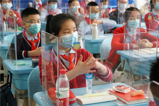 记者在教室里看到,每张学生课桌都有透明的U形“飞沫隔离板”,能最大限度阻断学生开学复课后在课堂、课间、教室内就餐等时段的飞沫传播。