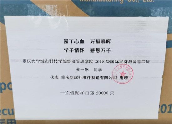“学校为了保障同学们的身体健康和安全顺利返校,付出了很多努力,我们深受感动,作为一名在校学生,我想尽自己的一份力量,与学校、老师和同学们一起抗击疫情。”5月18日上午,重庆大学城市科技学院收到一份非常厚重的“礼物”,来自学校经济管理学院国际经济与贸易专业2018级学生蔡一帆和家人,向学校捐赠20000个口罩,助力学校疫情防控和返校复课工作。
