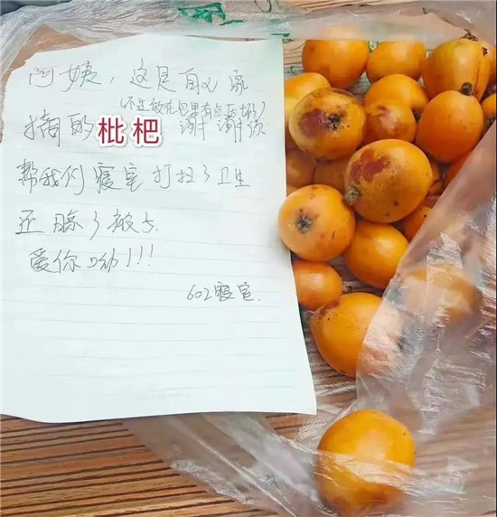学生公寓10栋602宿舍的全体同学,悄悄地为楼管老师送去亲自从自家果树上摘下带来的爱心水果,感谢楼管老师在返校之前为她们晾晒被子、开窗通风、打扫清洁。她们表示,这段时间学校一直为大家守护着校园,楼妈们也为同学们提供了许多帮助,非常谢谢老师们的付出。