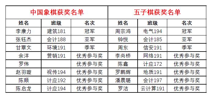 本次比赛共设置中国象棋、五子棋两个比赛项目,采用途游棋类小程序线上进行。参赛者根据自己的兴趣爱好,提前申报参赛项目,确定好项目分组。比赛过程中,参赛选手们相互切磋技艺,在棋盘上大家你攻我守,尽享博弈之乐。初赛环节采用两两PK淘汰赛赛制,经过多轮比拼,分别有10名选手晋级象棋组决赛,16名选手晋级五子棋组决赛。决赛环节采用积分赛赛制,晋级选手按照对战表进行多轮比拼,最终根据总积分确定比赛名次。经过激烈角逐,建筑181班李康力等6名同学夺得本次棋类比赛的冠亚季军。