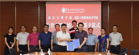 重庆工程职业技术学院校长张进、副校长唐继红热情接待了漆新贵一行。座谈会上,漆新贵对重庆文理学院在转型发展中的做法、取得成效以及应用型本科人才培养体系进行了介绍,对两校即将开展的专升本联合培养项目充满期待,希望以此为契机,进一步推动两校在专业建设、人才培养等方面的交流合作,促进共赢发展。张进对重庆文理学院在专升本人才培养方面给予的帮助表示衷心感谢,并简要介绍了该校发展历程、人才培养和社会影响等基本情况。张进表示,该校高度重视专升本联合培养项目,将举全校之力,配置最好的师资、最好的实习实训条件、最好的办学资源,办出特色和水平,努力将本次联合培养合作办学打造成为“样板工程”。与会人员还就进一步加强教学科研等方面的合作展开了深入交流。两校签署了专升本联合培养合作办学协议。