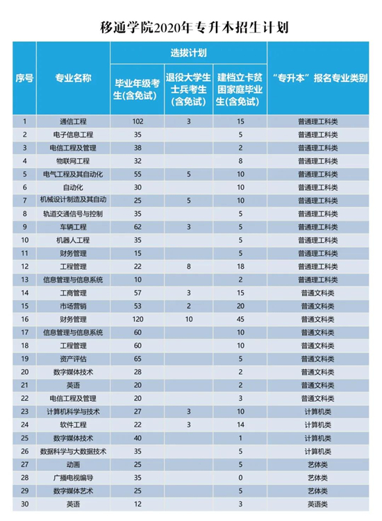 重庆邮电大学移通学院2020专升本招生计划人数为1500名,是重庆今年专升本计划最多的高校。涵盖了理工类,文史类,计算机类,艺术类,英语类五个类别,其中理工类计划620名,文史类610名,计算机类160名,艺术类95名,英语类15名,分布在24个优质专业进行招生。
