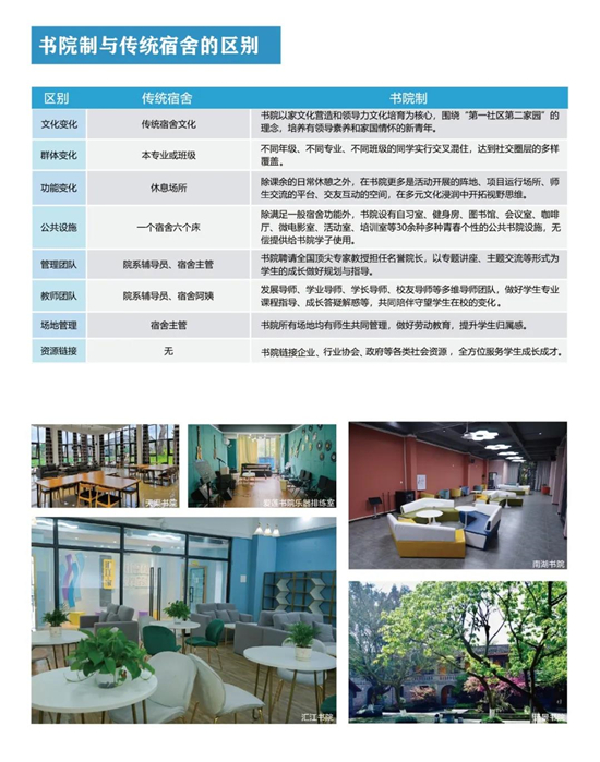 重庆邮电大学移通学院为全国唯一一所彻底实现全校书院制的大学,该校的学生“学习在学院,生活在书院”,书院制是结合中国传统的书院教学模式和西方先进的教育理念打造而成的,书院的建筑格局继承了中国传统院落式、围合制别墅。书院除了具备住宿功能之外,还设有会客厅、咖啡厅、心灵驿站、创意生活馆、手工作坊、影视厅、音乐厅、健身房等。这每一个项目都有专职的老师指导,这些老师都长期住在书院,与学生一起生活和学习。每个书院以“家文化”为核心,使同学间、师生间的关系更加紧密,学生的综合能力和人格成长更加饱满。学校现有竹逸书院、梅若书院、天渠书院等6个园林式书院和北山书院、爱莲书院、花果书院、别都书院等8所社区住宿式书院,为不同院系、不同年级以及不同地域的学生创造多元、立体的社交圈层。
