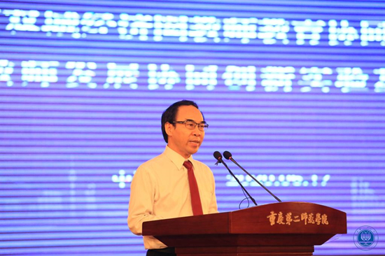 四川省教育厅副厅长崔昌宏在讲话中代表四川省教育厅向重庆第二师范学院“国家教师发展协同创新实验基地”正式揭牌、两省市教师教育协同创新合作及相关协议的成功签署表示热烈祝贺。他谈到,站在深化川渝合作的历史潮头,立足川渝两地创新发展的大气候,携手破解和深入推进中央最关心、社会最关注、群众最关切的教育问题,合作推进教师教育协同创新发展,是社会各界的重要期盼,机遇难得,使命崇高,责任重大。他认为,成渝地区双城经济圈教育协同发展前景广阔,有良好的合作机制,有强烈的合作需求,有广阔的合作空间。他强调,成渝地区双城经济圈教师教育协同创新未来可期,协议确定的六项重点任务涵盖多个领域,为两地教师教育一体化发展、教师教育示范区建设指明了方向、规划了蓝图、明确了路径。