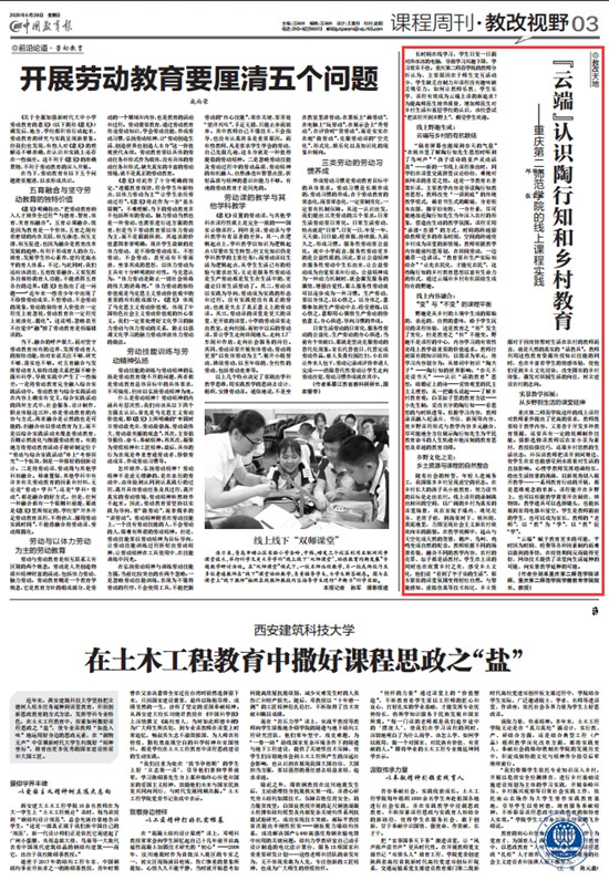 “隔着屏幕也能闻到春天的气息”“在桃林里了解陶行知先生思想时听到了鸟叫声”“孩子读诗的童声灵动活泼”……新的一节线上课程推出时,同学们在课堂交流群里议论纷纷,难掩对新网课的喜爱之情。这是一节教育名著赏析课,主要教学内容是导读陶行知教育思想。教师改变“一讲到底”的传统教学模式,戴着书生式的眼镜,身着粗布衣服,脚穿旧布鞋,一身朴素,尽可能地接近陶行知先生当年深入农村的形象,营造出生动的教学氛围。课程采用“录播+直播”的方式,时间的跨越留给教师更多的准备时间,空间的跨越使乡村成为课堂的新情境。教师根据教学内容提前构思筹划,在田间劳动,一边锄草一边讲课。“教育要和生产实际相结合”“必先农民化,才能化农民”,这些陶行知的乡村教育思想以富有生命力的形式,通过云端和乡村有机联结生成特有的野趣。