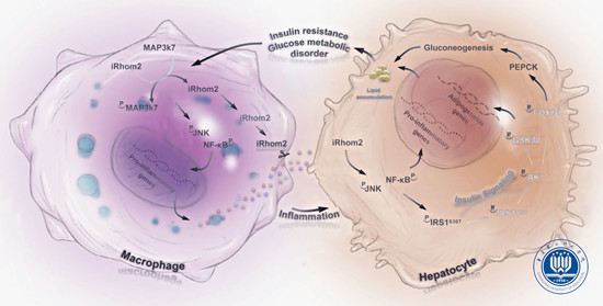 课题组围绕这一科学问题,进一步建立了iRhom2功能性突变动物模型,采用Rosa26截断介导和BMT转植等手段首次证实iRhom2促进NAFLD的发生,发现iRhom2通过靶向MAP3K7磷酸化互作过程,激活下游信号,进而介导“心灵炸弹”因子(Mind Bomb)和GSK激酶活化,促进NAFLD发生。该项研究工作为NAFLD的治疗以及iRhom2靶向药物的研发提供了崭新的思路,也为团队开发洋蓟系列护肝大健康产品提供了理论依据。