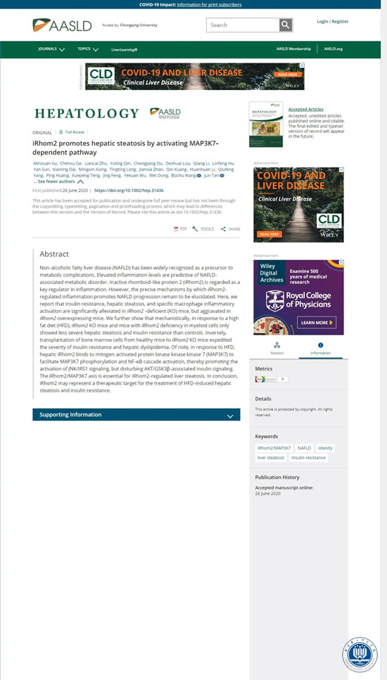 近日,重庆第二师范学院三峡库区药用资源重庆市重点实验室,首批入选“重庆英才计划•创新创业示范团队”的谭君教授研究团队在国际肝病学领域顶级期刊《Hepatology》(影响因子:14.971)上以长文形式发表了题为“iRhom2 promotes hepatic steatosis by activating MAP3K7-dependent pathway”的研究论文,该文还被选为《Hepatology》新一期的封面论文。