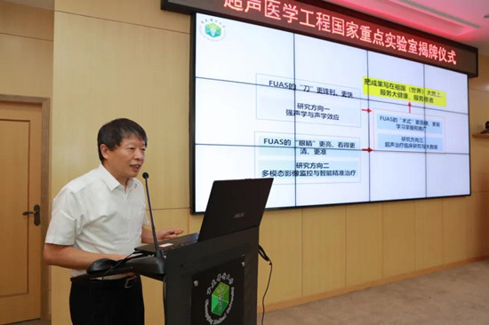 王智彪介绍了实验室的建设历程和运行情况。实验室以领先国际的超声治疗技术为主线,围绕强声学与声学效应、多模态影像监控与智能精准治疗、超声治疗临床研究与大数据三个研究方向,瞄准世界科技前沿,面向国家战略与地方经济社会需求,成功搭建了以超声治疗为代表的微无创医学学术和技术平台。