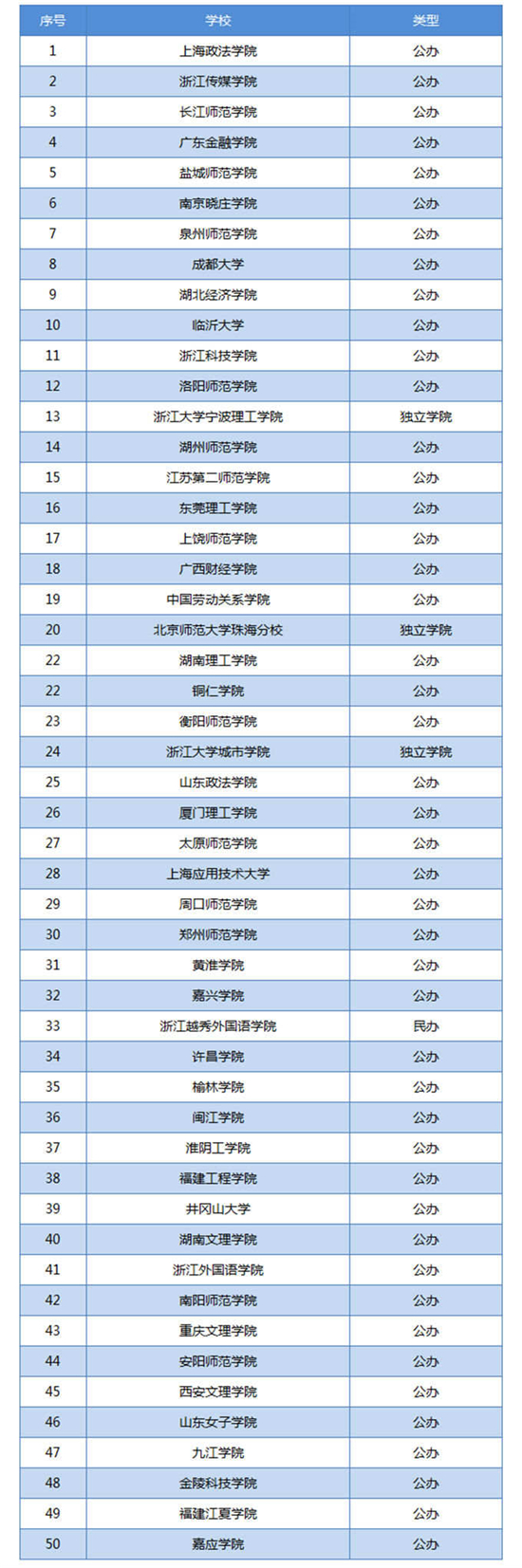 “中文社会科学论文”数据来源于“中文社会科学引文索引”(CSSCI)数据库。CSSCI数据库由南京大学中国社会科学研究评价中心开发研制而成, CSSCI从全国的中文人文社会科学学术性期刊中精选出学术性强、编辑规范的期刊作为来源期刊。 “中国新建(应用型)本科高校综合竞争力排行课题组”(ICAUR)由国内高等教育研究权威专家、部分应用型本科高校书记校长组建,课题组致力于我国新建(应用型)本科高校的评价研究,推动我国新建(应用型)高校实现高水平发展。我国新建(应用型)本科高校中文社会科学论文排行榜前50强见下表。