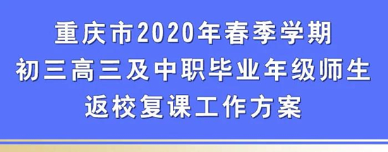 根据教育部《中小学校新型冠状病毒肺炎防控指南》和《重庆市学校新型冠状病毒感染的肺炎防控工作指南(试行)》《重庆市新冠肺炎疫情防控期间开学工作指南(试行)》《学校及托幼机构新冠肺炎疫情防控技术指南》,结合重庆市初三、高三及中职毕业年级返校复课实际,特制定本方案。