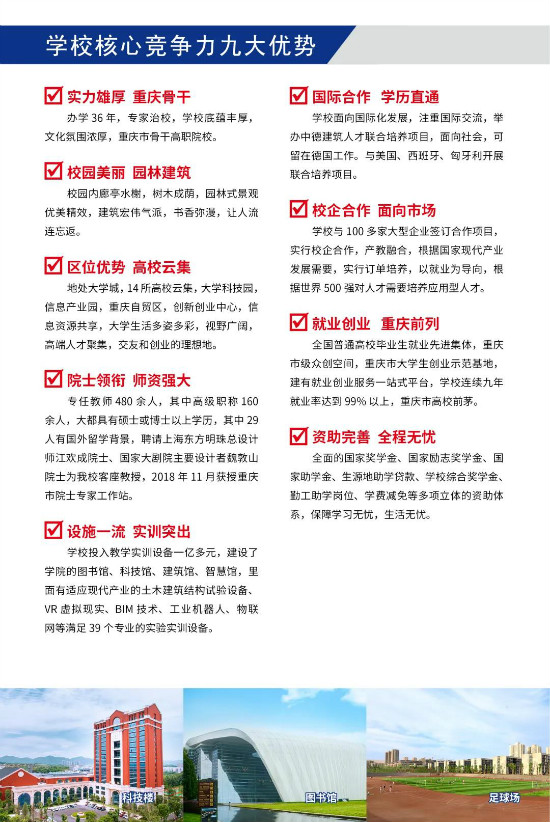 学校构建了土建类、装备制造类、信息技术类、现代服务业类和设计艺术类五大专业群,共39个专业。学校已发展成为重庆市骨干高职院校、依法治校示范学校、重庆市虚拟现实内容制作与体感设备研发工程技术研究中心(省部级中心)、重庆市装配式建筑产业发展基地(人才培训类)等。