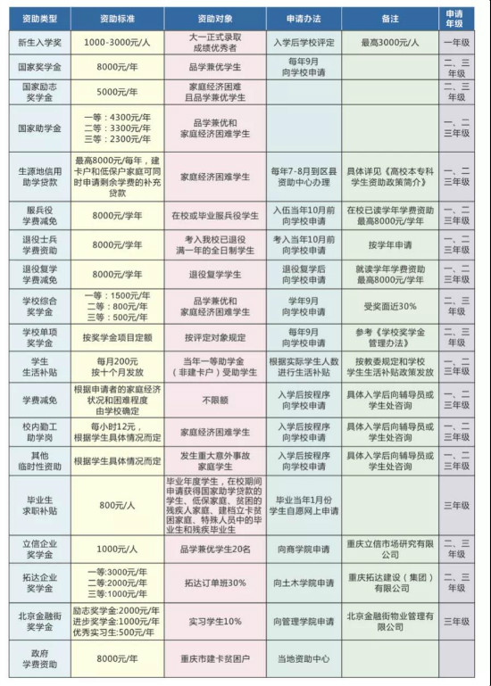 根据《2020年高校本专科生教育阶段资助政策简介》,包含:国家奖学金、退役士兵学费资助等19项资助类型,参照《重庆建筑科技职业学院奖助学金简表》执行,学校承诺:不让被我校录取的任何一个学生因贫失学。资助热线:023-61691899(招生就业处)、61691882(学生处),详询登录“重庆建筑科技职业学院学生处”网址:http://www.cqrec.edu.cn/xsc。