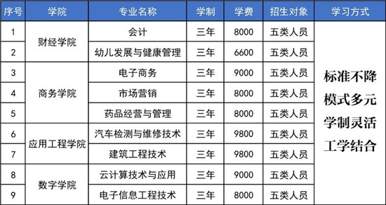 1、下岗失业人员、农民工、高素质农民、企业员工:所有专业学费学院资助50%,自己缴纳50%;学院资助后最低学费仅收3300元/年/生。