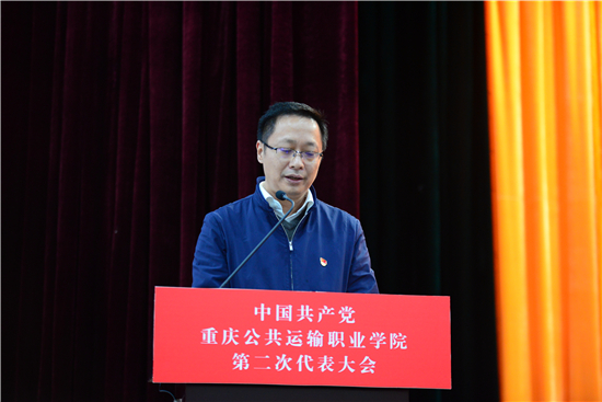 学校党委书记彭超代表中国共产党重庆公共运输职业学院第一届委员会,作题为《发挥国企办学优势 、深入推进产教融合,为建设高水平高等职业院校而努力奋斗》的工作报告。