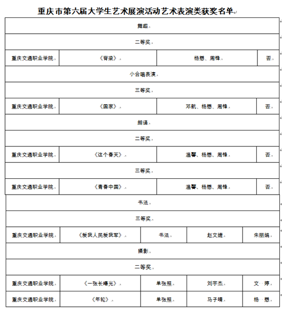 重庆交通职业学院此次选送的五个项目成功斩获七个奖项,展现了重庆交通职业学院学生朝气蓬勃、积极向上的青年风采。本次活动对于加强校园文化建设,提高学生审美素养,展示当代大学生良好精神风貌和高校艺术教育成果具有积极的促进作用。