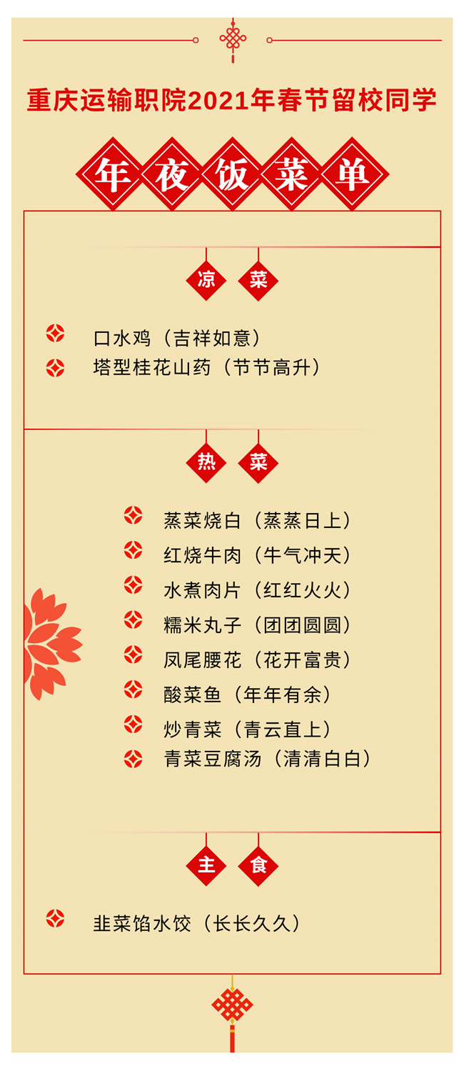 刚刚过去的这个春节,重庆公共运输职业学院为该校唯一留校学生,准备了一桌有特殊寓意、荤素搭配的“丰盛”小份年夜饭,让这名唯一留校学生在寒冬里感受到家的温暖。